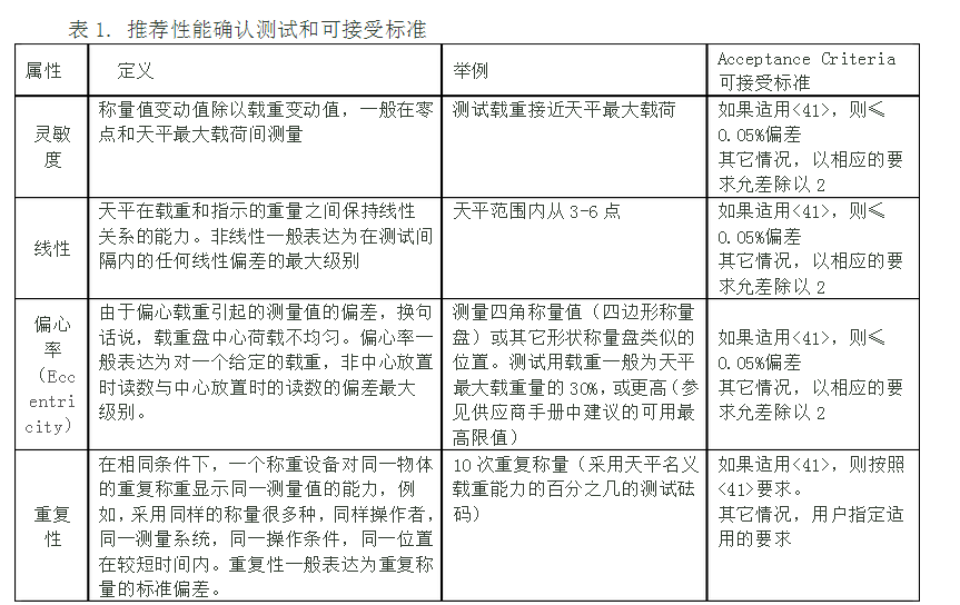 表1提供了一個天平zui重要屬性的清單,在性能確認中應該進行評估。根據應用的風險不同,要求的稱重允差不同,有時該類測試可以省略。如果有證據表明該屬性僅對稱量性能形成很小的影響,則也可以省略對其進行的測試。任何所用的程序均應與公司內部,適用于該特定天平的標準操作規程一致,并應進行充分判定。性能確認應按標準操作規程的描述周期實施,各測試的實施頻率可能根據屬性的關鍵程度不同而不同。