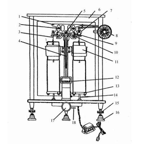 1橫梁 2平衡螺絲 3吊耳 4指針 5支點刀 6框罩 7圈碼 8指數(shù)盤 9承重刀 10支架 11阻尼內(nèi)筒 12投影屏 13稱盤 14盤托 15螺旋腳 16墊腳 17開關(guān)旋鈕(升降樞) 18微動調(diào)節(jié)桿