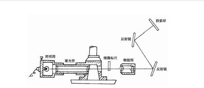 光源發(fā)出的光經(jīng)聚光管聚光后,照在指針下端的透明縮微標(biāo)尺上,再經(jīng)過放大鏡筒(物鏡筒)放大,由反射鏡反射到投影屏光屏,