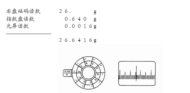 ②指數(shù)盤內(nèi)圈(10~90mg)的確定:再轉(zhuǎn)動內(nèi)層指數(shù)盤,先加50mg,如光屏上標(biāo)尺右移,表示的加砝碼重了,關(guān)上升降旋鈕。改加30mg,如光屏上標(biāo)尺左移,表示所加砝碼輕了,關(guān)上升降旋鈕。改加40mg,如光屏上標(biāo)尺左移,表示所加砝碼輕了。這表明所加砝碼的質(zhì)量應(yīng)在 40~50mg,此時內(nèi)圈即確定。