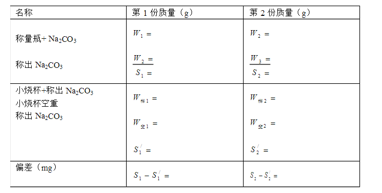 記錄1W;從其中移取約0.3~0.4g(1/3左右)于**個小燒杯中后,精確稱量剩余質(zhì)量,記錄2W;從中再移取約0.3~0.4g于第二個小燒杯中,精確稱量剩余質(zhì)量,記錄3W。 3. 再分別稱量已裝有Na2CO3樣品的小燒杯的質(zhì)量,記錄1樣W和2樣W。 4. 結(jié)果的檢驗