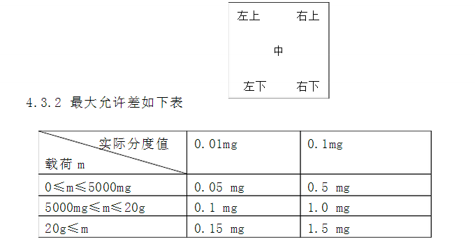 4.3.1 先檢查零點,再用已經校準過的三個砝碼校準天平2mg,50mg,80g。放在如下圖中心、左上,左下,右上,右下五個位置,各位置示值誤差不得超過zui大允許差。填寫R-SOP/2-0202-01《XS205電子